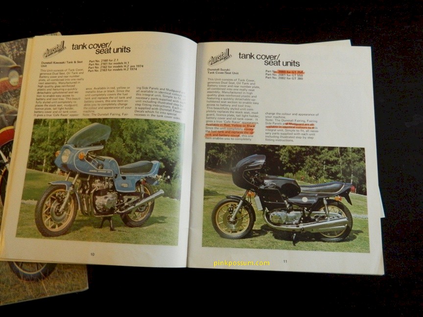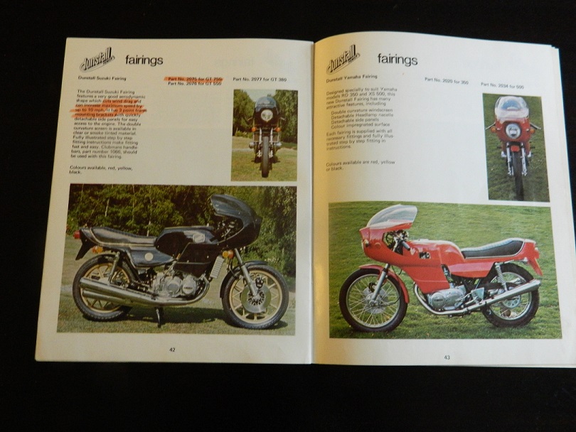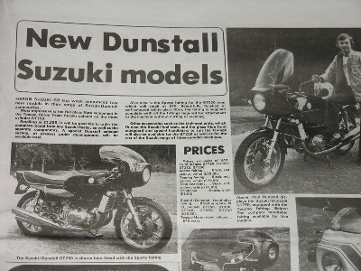 Dunstall did offer a complete body kit comprising a tank cover, two up seat and side covers and integrate rear fender (mudguard). They also offered a GT750 specific fairing comprising main section, sides, screen , headlamp surround and brackets. They were initially offered in 1976 to fit the A model and later were offered to fit any model GT750. A couple were registered in the UK as Dunstall Suzukis but that speaks to laxity of the rules rather than to accuracy of manufacturer.