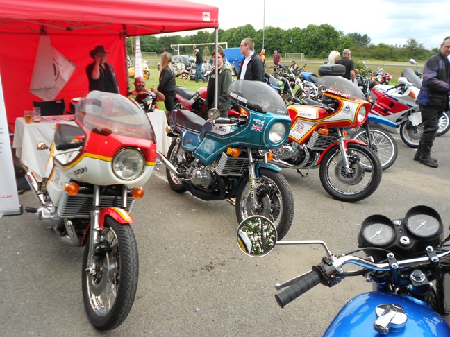 There are a few Dunstall GT750 Suzukis in the UK and on one recent rare sunny day, three appeared at the same time. It is rumored that this rare occurrence may have been historic and one or more may have arrived in the back of a van, but that was in the UK where sunshine is not so common - at least not for a whole day at a time. Here we have the Three Amigos.