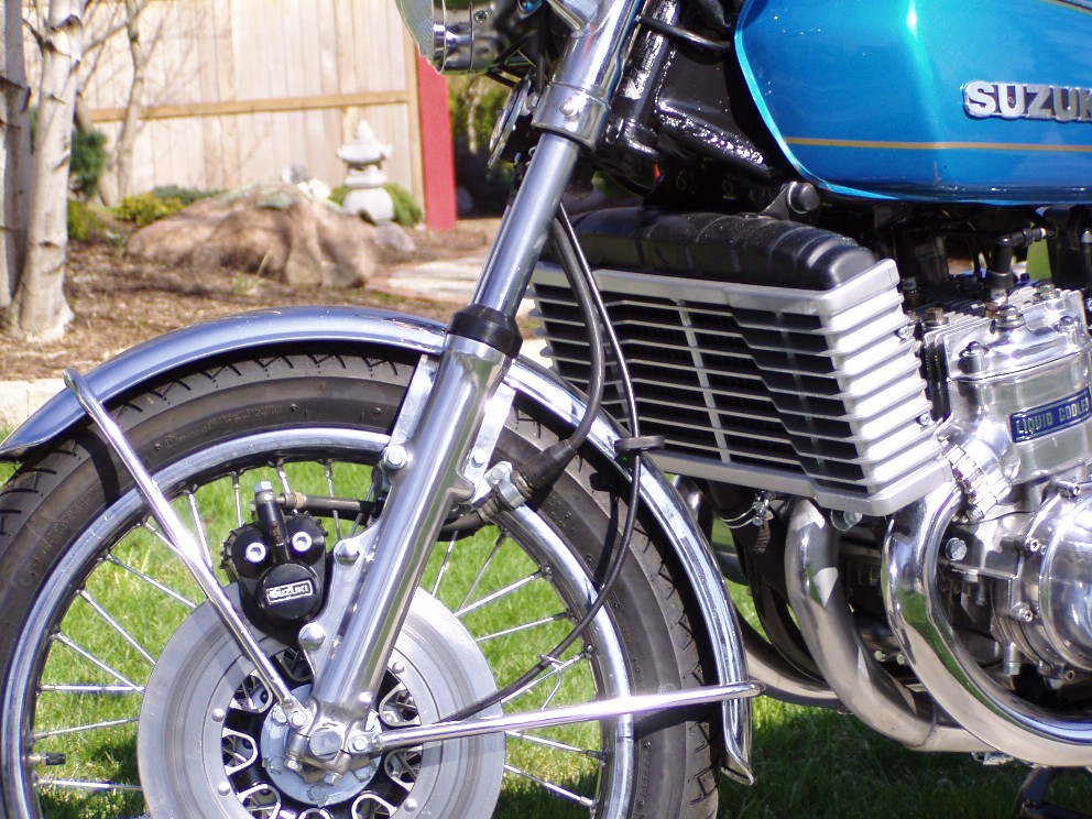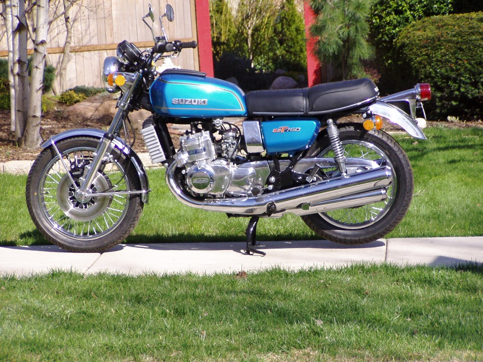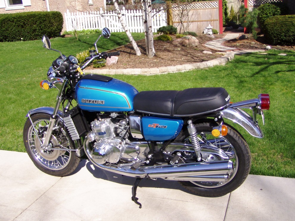 Fully rebuilt from the ground up and almost 100% original. When I acquired this bike, it had done 33,000 miles in the hands of the first and only owner who bought it new in 1976. He rode all over the country on it, until he started a family and then he stuck it away in his garage, where it has sat since 1986. The bike was last registered in Illinois in 1981 and comes with the original Illinois title, owners handbook and service manual. What attracted me to this bike was its degree of originality and general condition. I like bikes that look right for their age and look well cared for. Modern show chrome and paint with a dozen coats of clear, are so different to the style of the day and look out of place to my eyes. The motor was stuck solid and refused to turn over, so it was completely stripped and rebuilt. New seals, gaskets and a crankshaft rebuilt by one of the country’s leading crankshaft engineers were fitted. The pistons and barrel were OK, and all that was needed was a light skim on the top and bottom barrel faces to bring it up to scratch. Alloy parts were either polished or painted to original specifications. The motor is currently fitted with a high compression head, and mildly ported barrels. The buyer has a choice of keeping those parts on the bike, or else I can swap them out for totally stock parts or I could even fit a set of the less powerful, L model barrels which give more bottom end torque. It currently has a custom Dyna electronic ignition, but the buyer can have it with stock points ignition if they prefer total originality. The carburetors were completely stripped, cleaned and rebuilt with new jets. Needles were inspected and showed no sign of wear so they were re-fitted. As they were assembled, they were adjusted and synchronized. The carburation retrofit fix for low speed surging was also taken care of at the same time. While the motor was out, the frame was stripped and repainted in gloss black. Swingarm bushes were not so good, and they were replaced and upgraded to bronze bushes, which were reamed to size and fitted with new bearing sleeves. The front forks were stripped, cleaned and polished and assembled with new fork oil and oil seals. Wiring was all checked and tested and any non-functional components replaced, including the battery. All the chassis and external motor hardware was re-plated in bight zinc plate and heat-treated. Wheels were rebuilt and fitted with new Bridgestone BT45 tires and tubes, which are the best tires available for a GT750. A new chain and sprockets were also fitted. Brakes were completely overhauled and fitted with new Brembo brake pads at the front and new brake shoes at the rear. Tank and side covers are the original manufacturers paint and have minor blemishes consistent with a bike that is well used and looked after. All the chrome plate is original and has the usual minute pits and imperfections, which add to the patina. Exhausts have been cleaned out and are in great condition. The seat was professionally re-covered with a cover that is embossed to the exact shape and pattern as the original factory seat. The stainless trim has been polished and refitted. Even the fuel tap (petcock) was stripped and rebuilt with all new seals. This bike needs nothing except an owner that has the time to ride it and the desire to own a Japanese Classic. More details on what was done in the rebuilding process along with "before" pictures. |