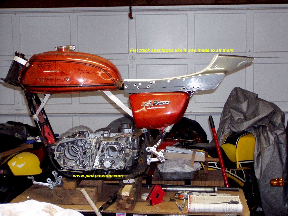 The decision had been made early on, that the look had to be simple and relatively stock - translation: stock tank and side covers over cleaned up frame. When the seat arrived, the look started to gel and design decisions were starting to be set.