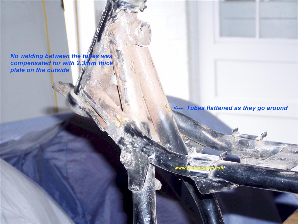 When I looked at the frame it was obviously very heavy and not very stiff. Around the steering head two pairs of tubes cross over, but Suzuki had decided to keep the bike narrow and had squeezed the tubes in, making the front end prone to flex and twist. They then clad that abomination of a design, in sheets of thick heavy steel which contributed little to stiffness, but added a chunk of weight. The frame shape is the classic Norton Featherbed style lozenge which is great for a 50 HP single, but not very good for a heavy, powerful (yeah right) bike like a GT750.