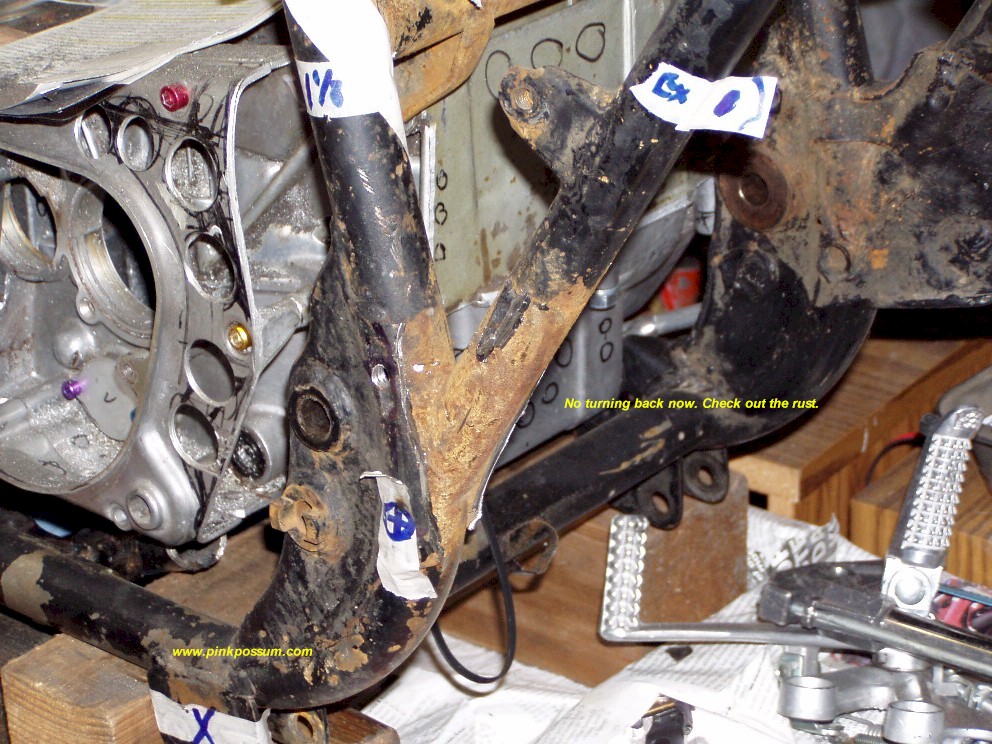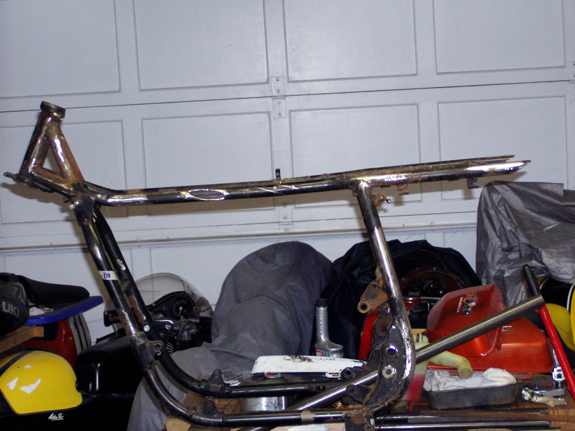 The first item of business here, was to cut off all the parts that will not be needed in the new build. It wasn't clear what the right sequence would be. Some things, like chopping off the footrest mounts clearly wasn't on the critical path, but sometimes it's best to just start doing something and see if a clearer picture emerges. Or as Edward DeBono put it more elegantly - motion generates direction.