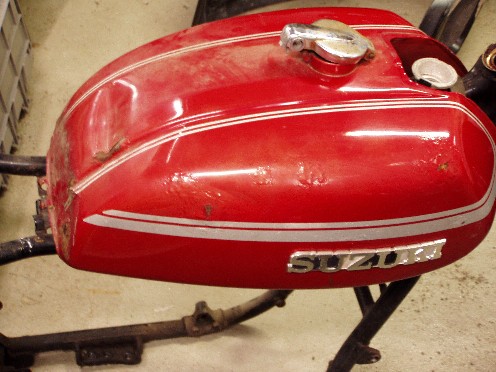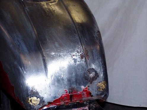 There are several rust bubbles on the right side and at the rear where the seat rested against the tank there were rust spots that looked like they may be a problem. There's also that nasty dent in the rear and a smaller crease on the right side.