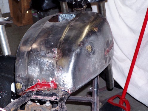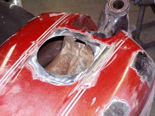 After the wash, the damaged areas were cleaned off with a sanding disk on that "ankle grinder", as my kids used to call it. Of course I had completely forgotten that a GT750 tank is very shallow at the front where it clears the radiator filler cap. That oversight led top a slight reshaping of the tunnel which in turn tore a hole in the steel. Ah well, just another item to weld up later.