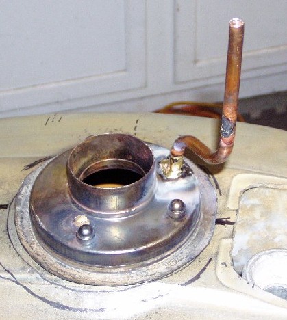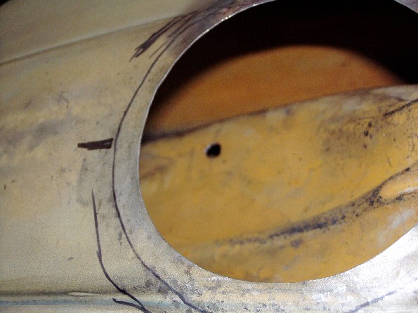 Here you can see the drain tube protruding from the bottom of the tank tunnel awaiting its destiny with the welding torch and brazing rod. |