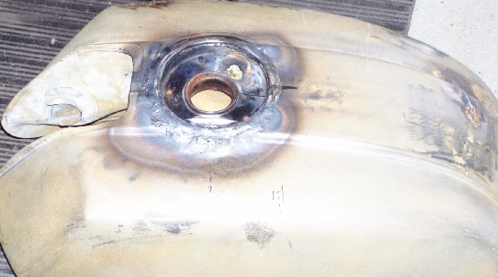 The filler neck was carefully aligned and welded into place. And just for the record, I never claimed to be a good welder. |
