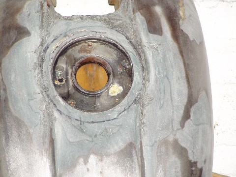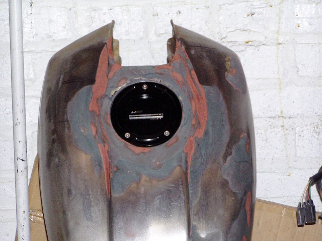 Before the filler plate could be welded in, we had to resolve the problem of the drain & overflow tubes. On the GSXR there are two tubes running from the filler cap to the bottom of the tank, as you can see above. in that picture, the "new" filler base is lying upside down in its new home, because that was the easiest way to photograph it.