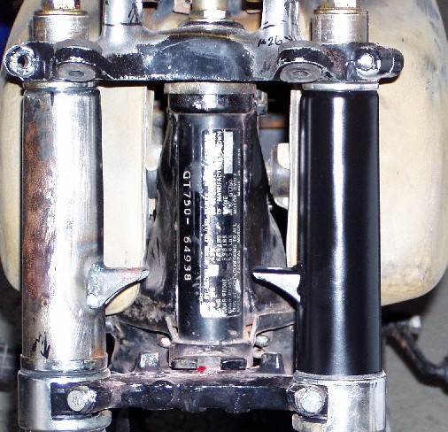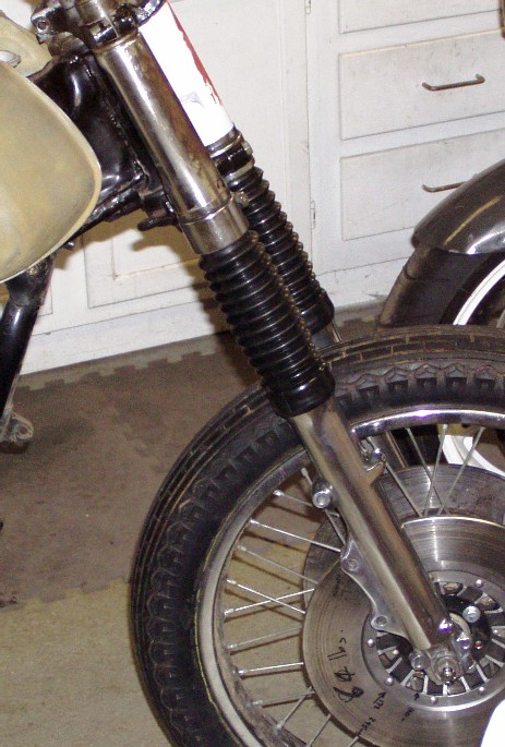 Next I installed a pair of those fork boots from Mike's XS to cover up the naked legs and add a touch of black. Fortunately, the lower edge was easy to slip over the fork slider in place of the original chrome dust covers. At the top they are slightly large for the legs, but slip inside the stock chrome lower triple clamp covers. Nothing wrong with a nice pair of legs clad in a thin black covering. Very Mrs. Robinson - for those among us old enough to remember that movie.