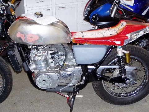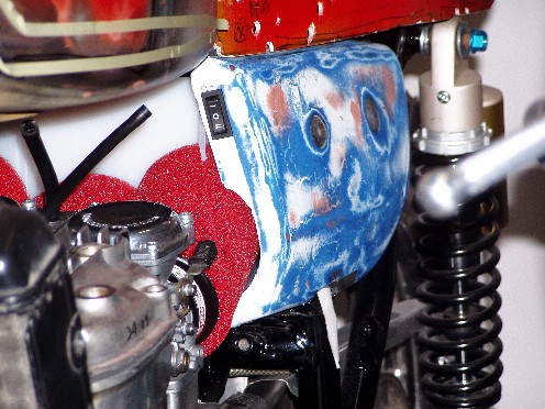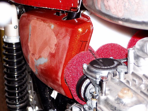 So far so good, but the first Law of Customizing is "change one thing, and you change everything". And so it came to pass, that the covers no longer covered and the oil tank was naked and ashamed because it could no longer hide its nakedness behind a shiny colored cover. The oil tank hid in the far corners of the shop and a new one was sourced from American Plastics. While the replacement tank was on order, a nice set of long UNI filters were obtained from a certain auction site. Of course they fouled the nicely modified covers, so something had to be done about that. The covers were attacked, I mean gently and carefully machined with the Dremmel and hand files to clear the filters. When the engine and carbs are firmly bolted in place, the side covers need to be finished off and then a mold will be taken, so that a fiberglass or carbon fiber side cover can be created.