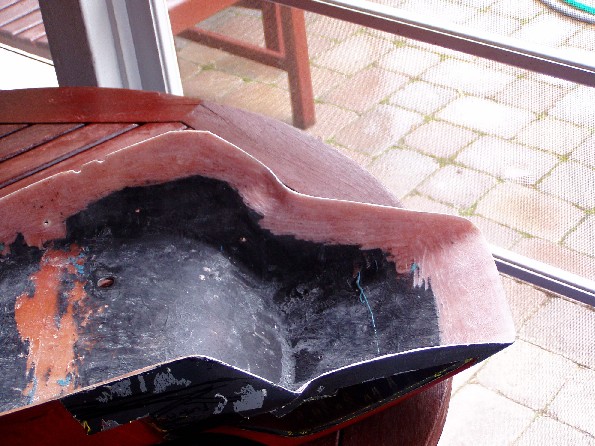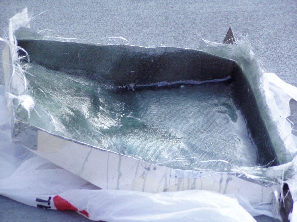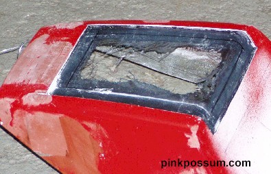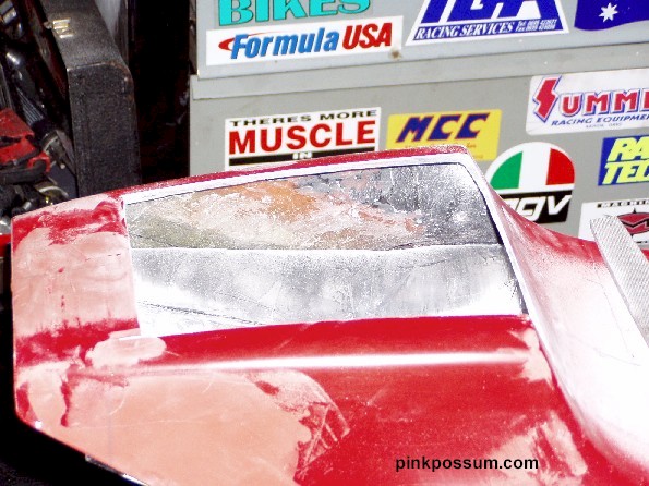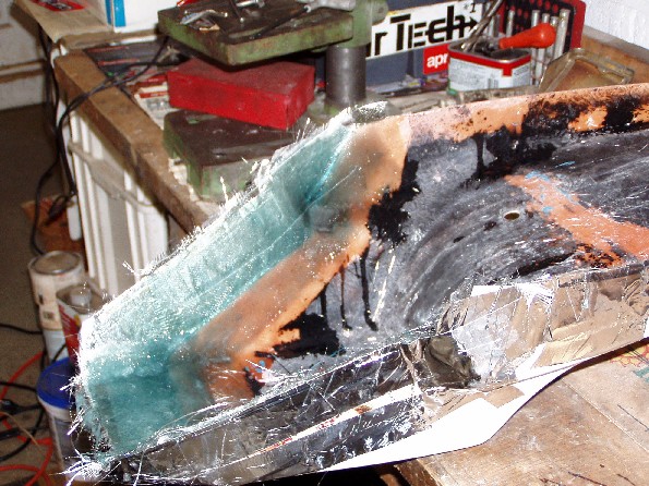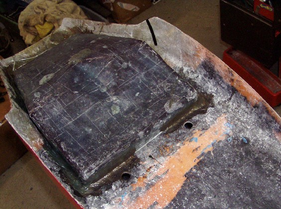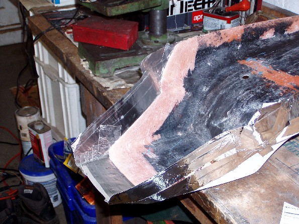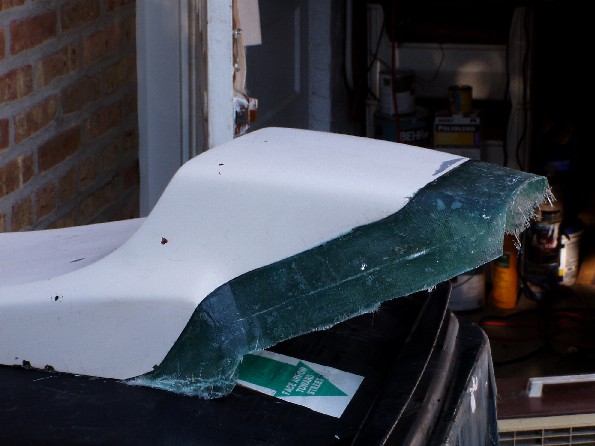 The obvious answer was to stretch the hump by a couple of inches. In theory that is quite simple, but things never quite work out the way they are supposed to. I cleaned up the lower surface of the seat so that the new fiberglass would be able to get a grip. Then I used Aluminum duct tape and stiff card to build up an extension to the existing hump. The hump was extended using fiberglass mat and cloth, let it dry and trimmed it with a Dremmel cut off wheel. After that followed the inevitable filling in pits and low spots and rubbing it down, and filling and rubbing etc until it was close to the shape I wanted.
